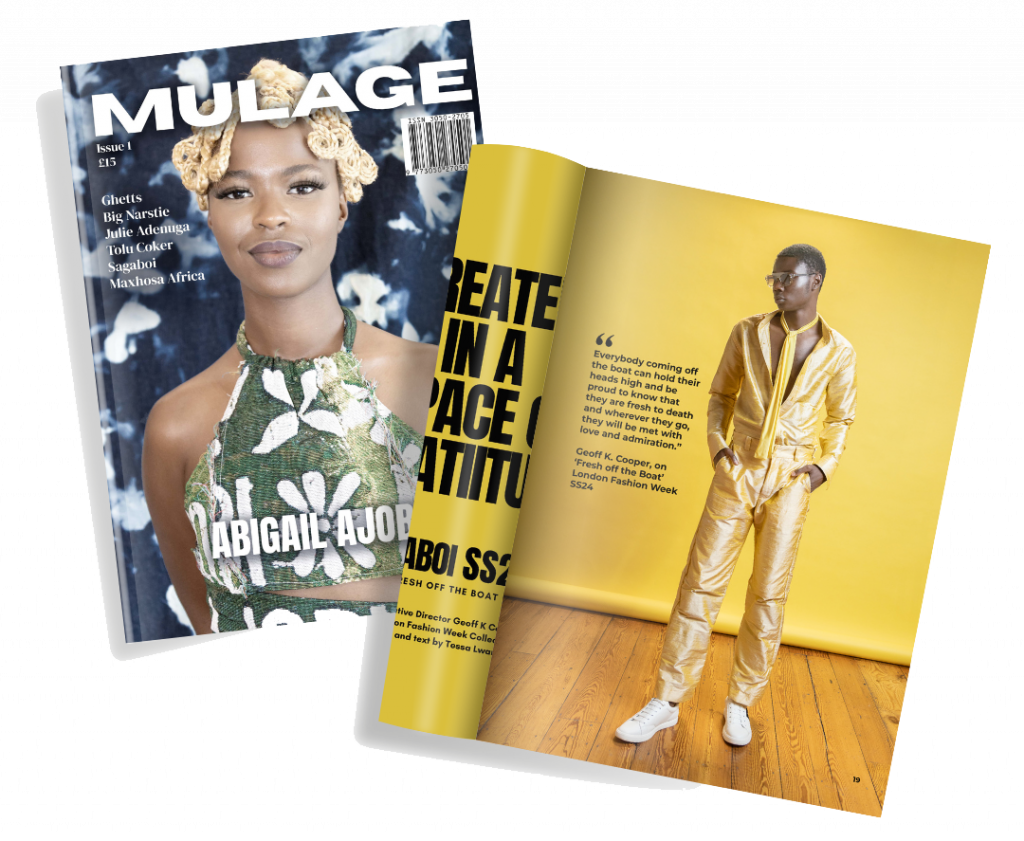 Printed on Recycled Uncoated Paper, packed with 64 pages of stories, vibrant photographs and links to buy from Black and Black mixed heritage Fashion Designers.